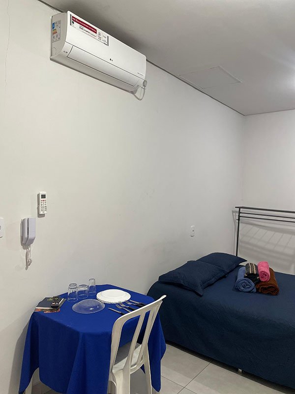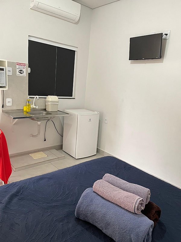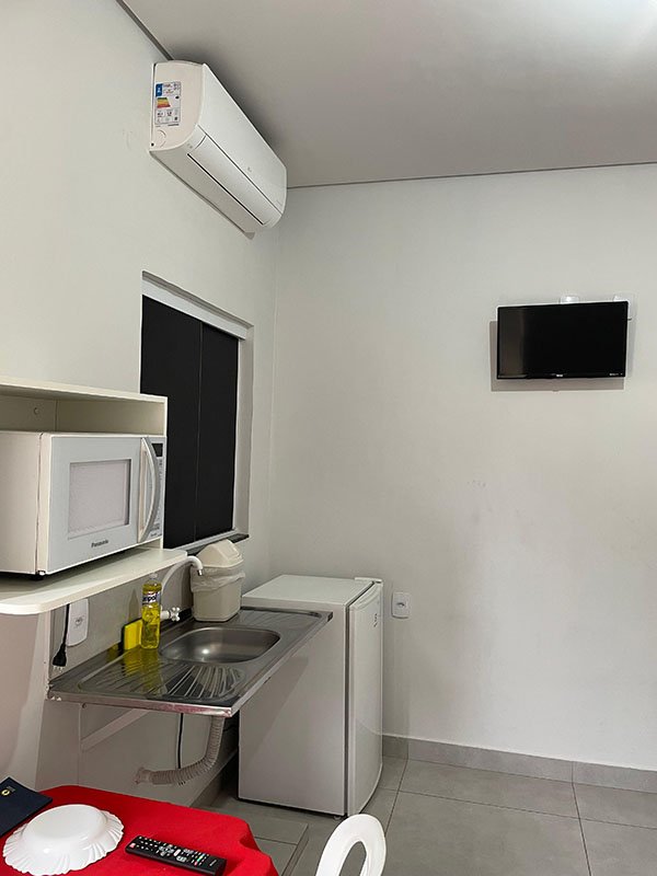 Suite Plus com cama de casal, roupas de cama inclusive toalhas, Ar condicionado, TV, Frigobar, microondas, internet Wi-Fi e interfone.