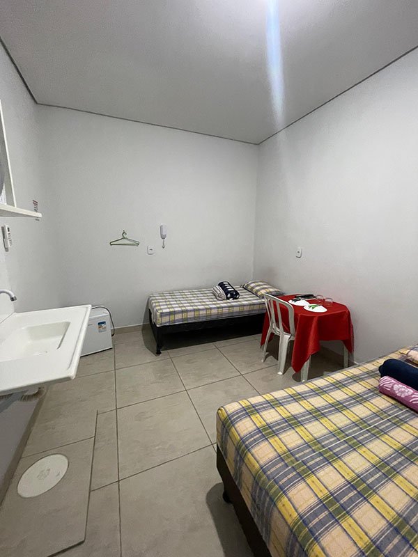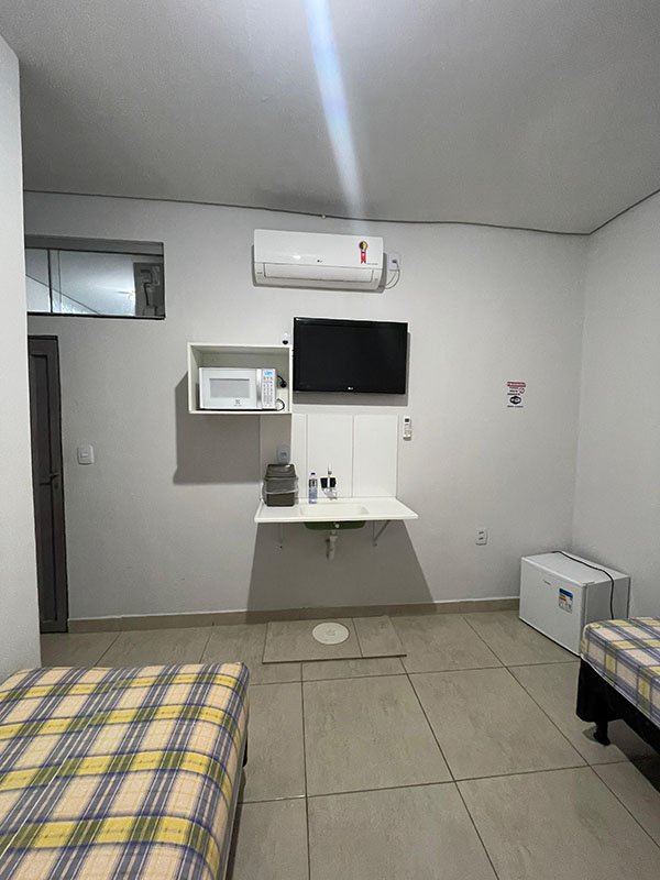 Suite Plus com 2 camas de solteiro, sendo duas camas Box , Ar condicionado, TV, Frigobar, microondas, internet Wi-Fi e interfone.