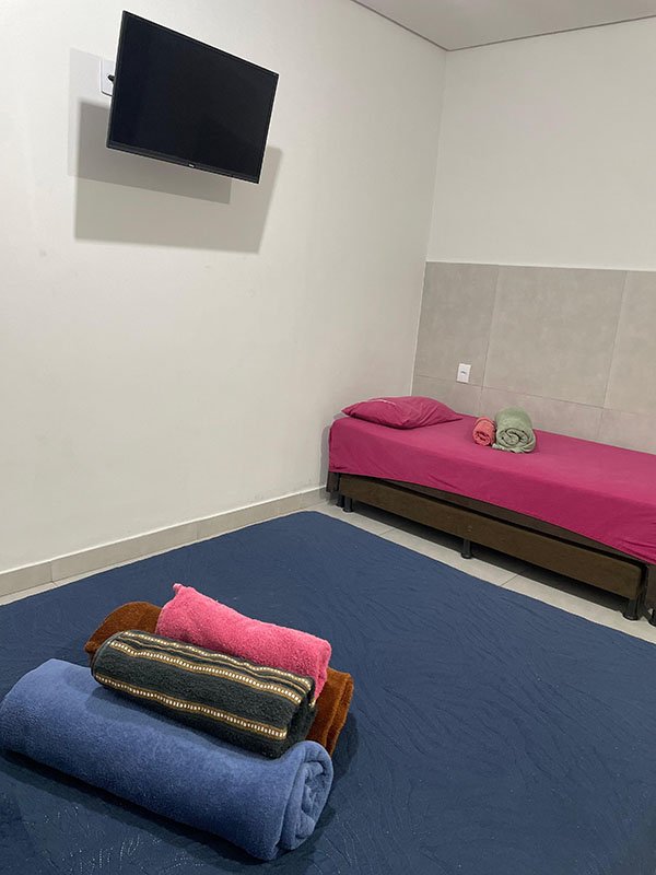 Suite Plus com cama de casal e cama de solteiro, roupas de cama inclusive toalhas, Ar condicionado, TV, Frigobar, microondas, internet Wi-Fi e interfone.
